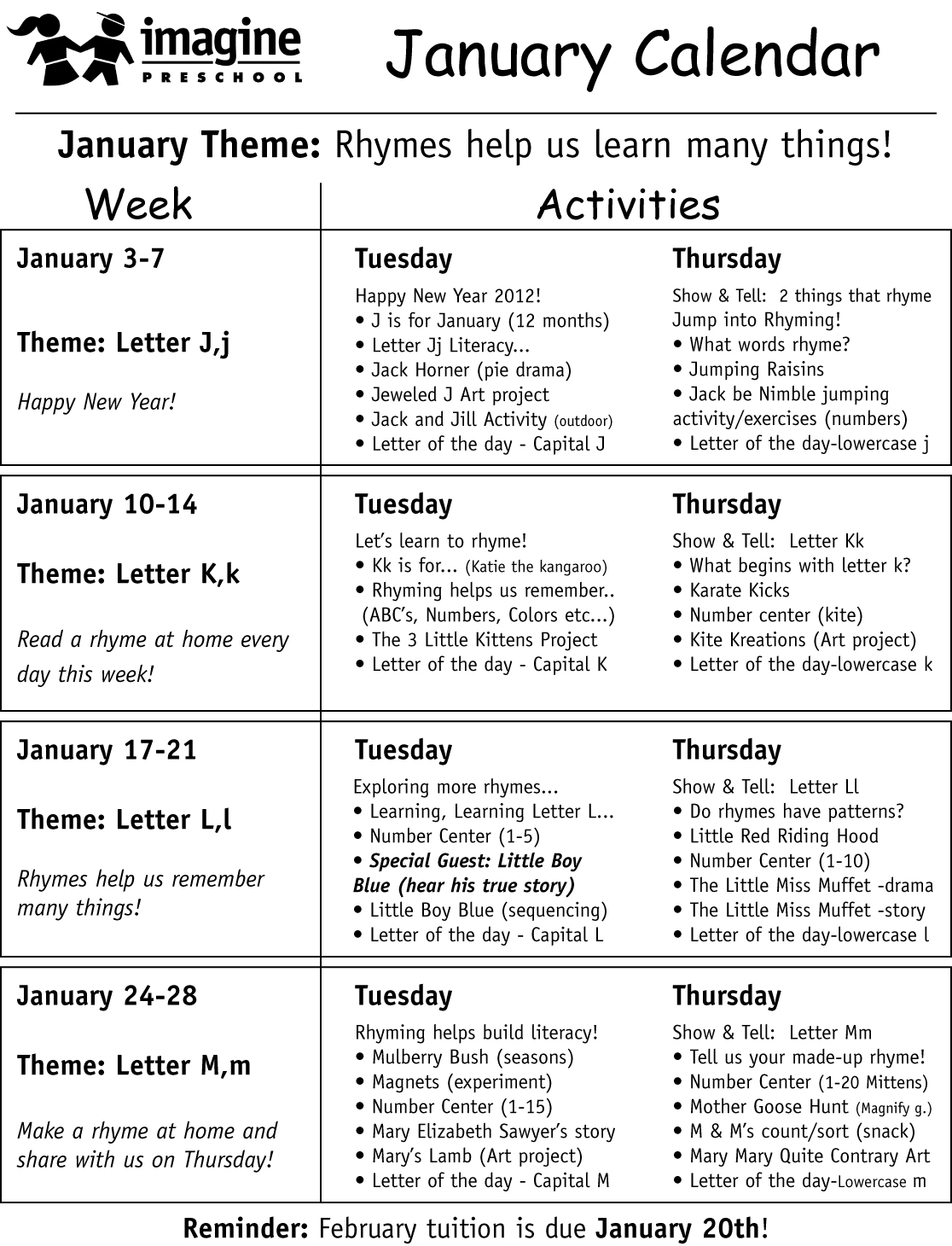 Each month at Imagine Preschool your child will engage in fun learning activities. Daily practice with the alphabet, phonics, reading sight words, putting letters together to make words, handwriting, math, science and art is outlined in each monthly calendar. Your child is consistently taught academics in a variety of fun filled, engaging, and hands-on activities each day!
